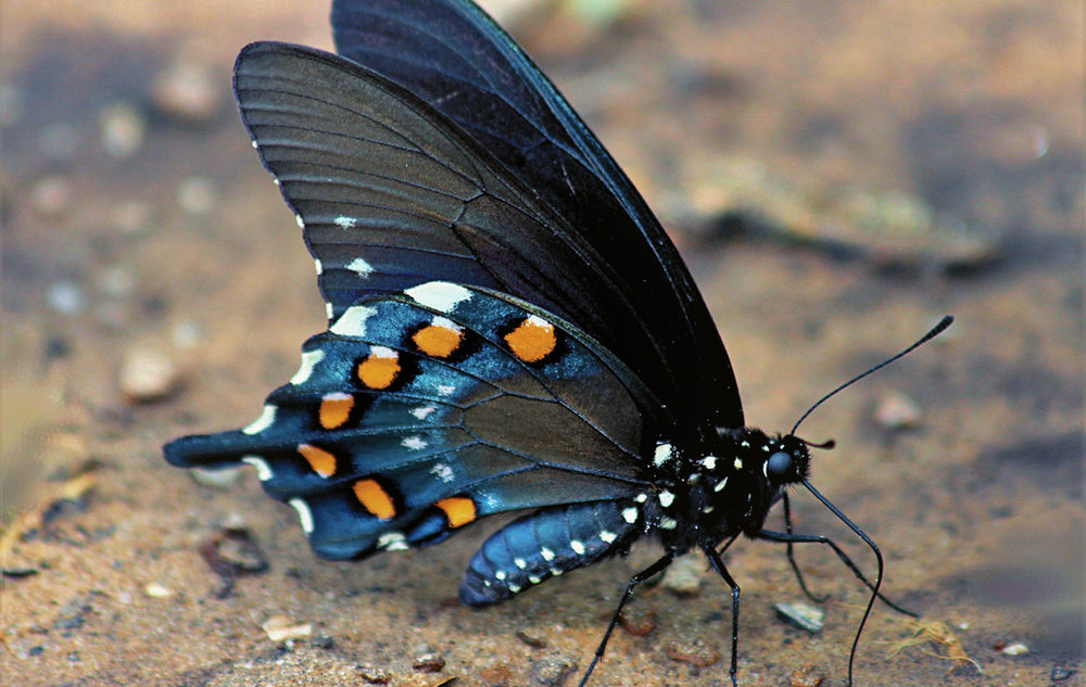 Female iridescence is duller in appearance. Bright orange spots are visible on the back end of the ventral wings. (The adults from Californian populations of these butterflies have smaller and hairier bodies and are thought to be a subspecies Battus philenor hirsute.)