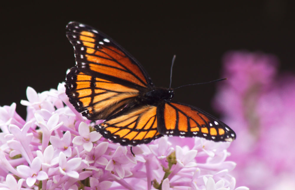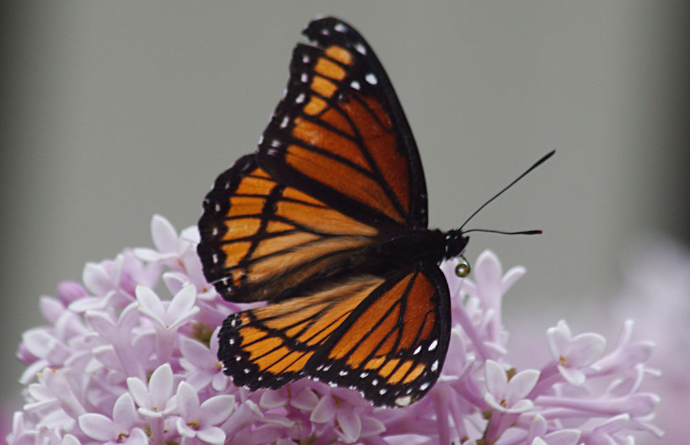 (The easiest way to differentiate between the Monarch and the Viceroy is to look for the transverse black lines on the trailing edge of the wings. The Viceroy has these transverse lines, whereas the Monarch does not.)